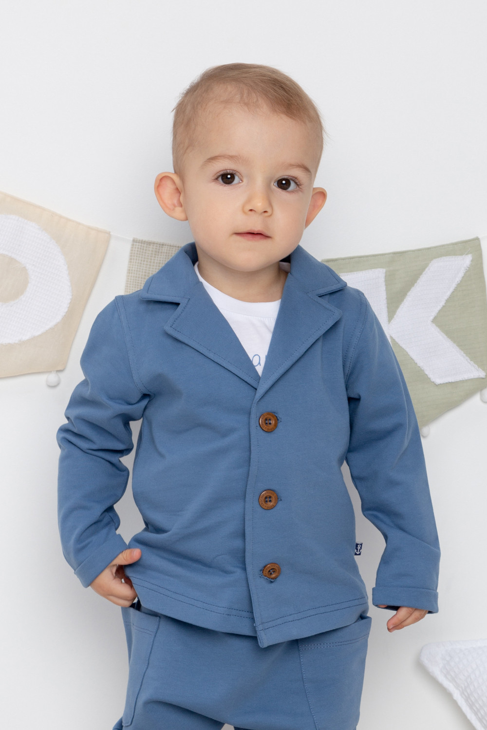 Трикотажный пиджак для мальчика, выполнен из петельчатого футера.Дополнительно