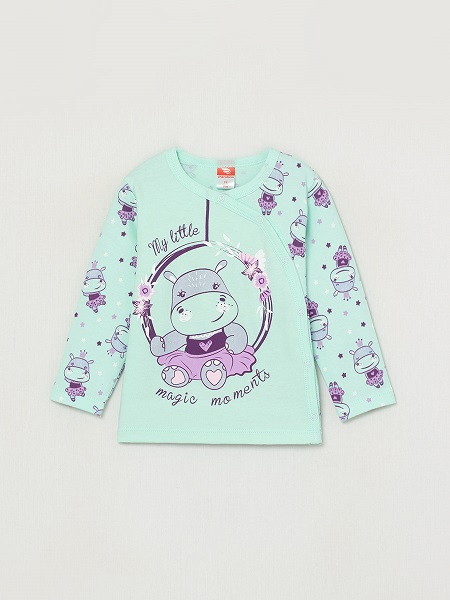 Кофточка из набивного интерлока с асимметричной застёжкой на кнопки. Правая часть переда выполнена из гладкокрашенного интерлока и оформлена принтом. Горловина и края бортов окантованы бейкой из рибаны в цвет переда. Низ изделия и рукавов обработан плоским швом вподгибку.Дополнительно