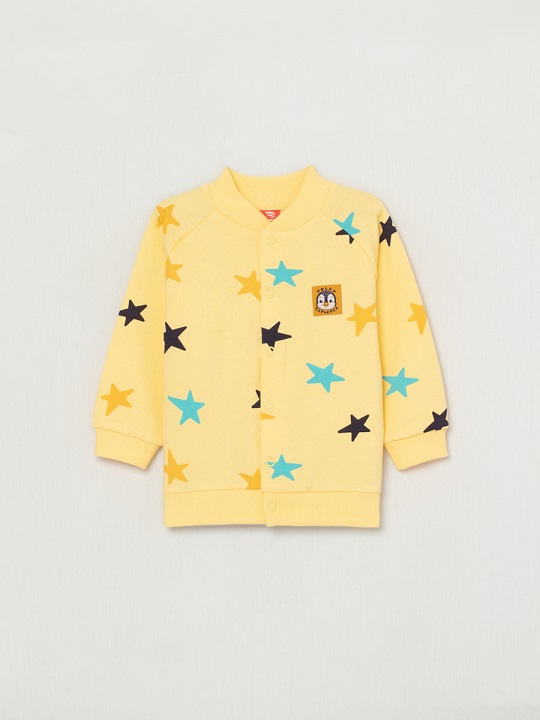Кофточка из набивного футера с начёсом с рукавом-реглан. Спереди застёгивается на кнопки. Воротник, манжеты и пояс из кашкорсе с эластаном в цвет основы набивного полотна. С левой стороны переда настрочена декоративная этикетка.Дополнительно