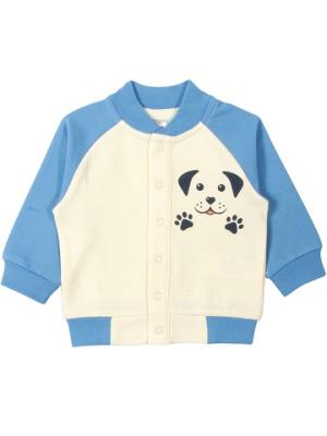 Кофточка с длинным рукавом-реглан, центральной застежкой - притачной планкой на кнопки. Воротник-стойка из рибаны с лайкрой. Рукава втачные с манжетами из рибаны с лайкрой. По низу притачной пояс из рибаны с лайкрой. На левой полочке выполнена шелкография мягкими красками.Дополнительно