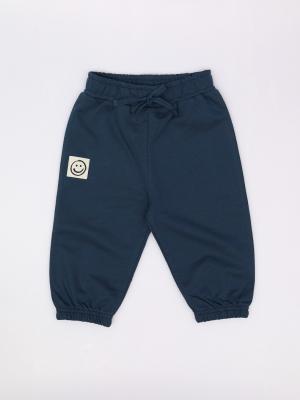 Брюки для мальчика из мягкого трикотажа. Пояс и низ брюк на резинке. Шнурок декоративный из экстрафорной тесьмы. На правой половинке декоративная жаккардовая нашивка в виде смайлика.Дополнительно