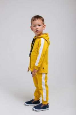 Брюки из однотонного петельчатого футера горчичного цвета. Украшены белыми вставками по бокам. Пояс регулируется по ширине с помощью ленты. Удобные карманы укреплены закрепками. Внизу эластичные манжеты.Дополнительно