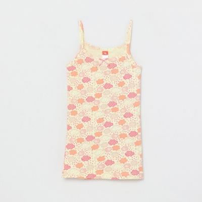 Набивная майка на бретелях из окантовки. Верхние срезы спинки и переда обработаны окантовкой из основного полотна. Посередине горловины переда пришит атласный бантик отделочного цвета.Дополнительно