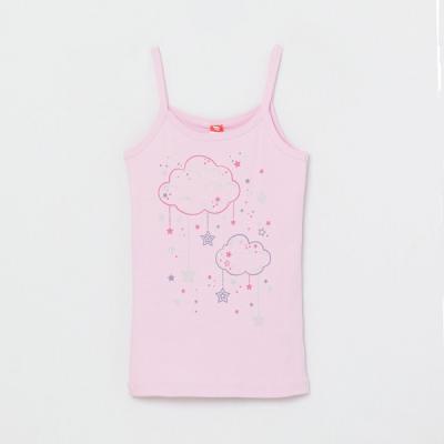Гладкокрашеная майка на бретелях из окантовки. Верхние срезы спинки и переда обработаны окантовкой из основного полотна. Перед оформлен шелкографией.Дополнительно