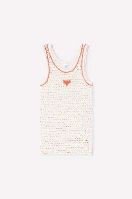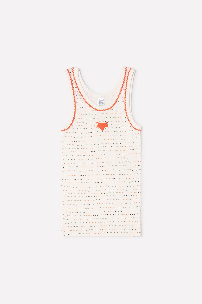 Майка на лямках из натурального хлопка. Сшита из эластичного материала рибана пенье. Украшена набивным рисунком и принтом на груди.Дополнительно