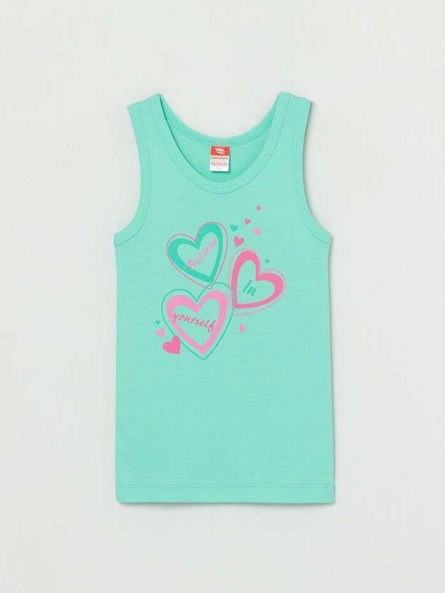 Майка с плечом из гладкокрашеного полотна. Горловина и проймы обработаны окантовкой из основного полотна. Перед оформлен шелкографией.Дополнительно