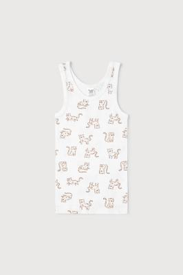 Майка на лямках из натурального хлопка. Сшита из материала рибана пенье. Украшена набивным рисунком.Дополнительно