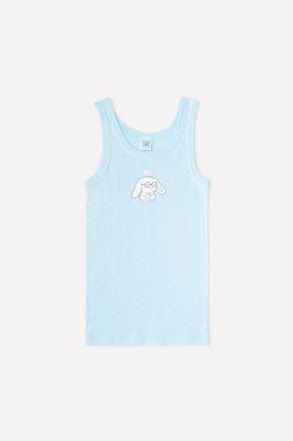 Майка на лямках из натурального хлопка. Сшита из эластичного материала рибана пенье. Украшена принтом.Дополнительно