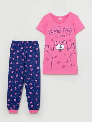 Футболка женская с короткими рукавами. Перед футболки декорирован принтом. Брюки из набивного полотна с манжетами по низу. На талии брюки собраны на резинку.Дополнительно