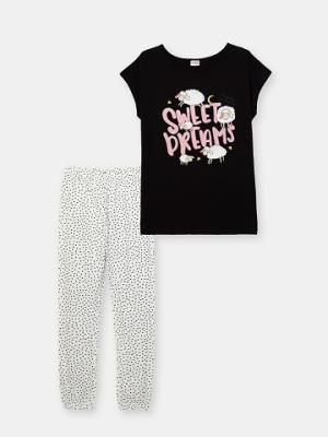 Футболка со спущенным плечом и принтом спереди. Горловина круглая, окантована бейкой из основного полотна. Брюки из набивного полотна с эластичными манжетами по низу. По талии брюки собраны на резинку.Дополнительно