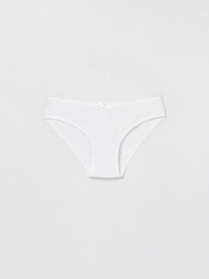 Женские трусы из гладкокрашеного полотна. Верх трусов и проймы ножек обработаны настрочной резинкой с ажурным краем. Посередине верхнего края переда пришит атласный бантик в цвет полотна.Дополнительно