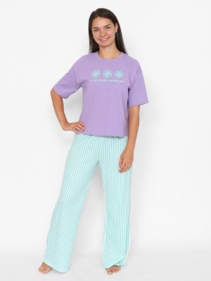 Трендовая пижама с широкими брюками-палаццо и укороченной футболкой-оверсайз с коротким рукавом, состоящий из 100% хлопка, который позволит коже дышать и не будет стеснять ваши движения благодаря мягкой трикотажной ткани. Комплект подойдет как ночная пижама для сна и как домашний милый костюмчик. Футболка декорирована принтом (надпись: Живи каждым мгновением). Свободные трендовые брюки в полоску, в составе комплекта для дома снабжены удобной резинкой-поясом и атласным бантиком. Мягкая пижама имеет оптимальную посадку, нигде не сдавливает и не доставляет никакого дискомфорта.Дополнительно