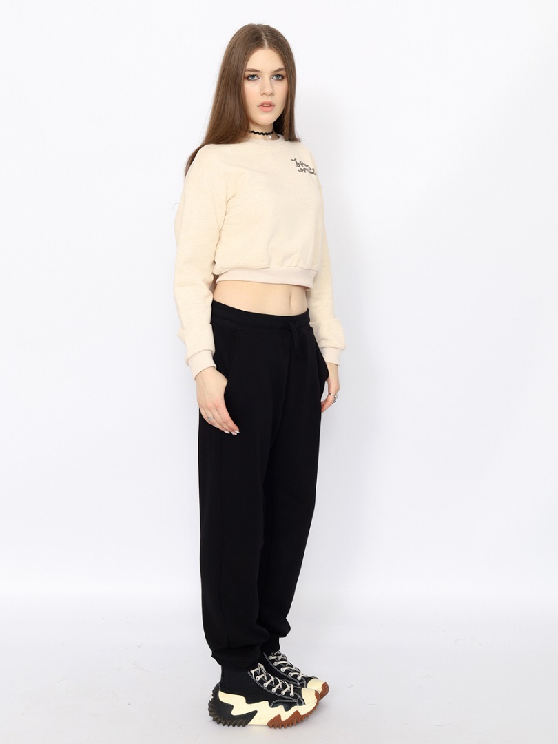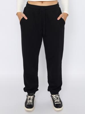 Свободные трикотажные брюки с карманами. В притачной пояс вставлена резинка и функциональный шнур. Нижние срезы брюк оформлены манжетами.Дополнительно