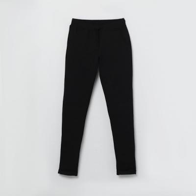 Брюки зауженные к низу, с подворотом. Пояс отрезной из кашкорсе с эластаном. В поясе обработана кулиска, кругловязаный шнур, с застроченными концами, вставлен в петли. Карманы наклонные, полукруглые. По входу в карман притачная обтачка из кашкорсе с эластаном, с отстрочкой по шву притачивания. На поясе по спинке выполнена шелкография.Дополнительно