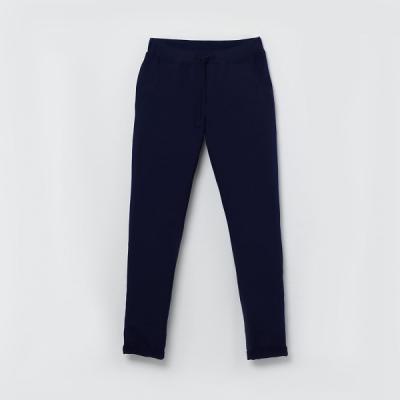 Брюки зауженные к низу, с подворотом. Пояс отрезной из кашкорсе с эластаном. В поясе обработана кулиска, кругловязаный шнур, с застроченными концами, вставлен в петли. Карманы наклонные, полукруглые. По входу в карман притачная обтачка из кашкорсе с эластаном, с отстрочкой по шву притачивания. На поясе по спинке выполнена шелкография.Дополнительно