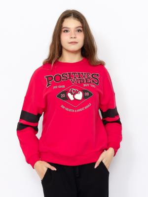 Джемпер для девушек с длинными рукавами оформлен в спортивном стиле. Свободный силуэт с заниженной линией плеча не сковывает движения. Нижние срезы переда и спинки оформлены притачным эластичным поясом. Рукава с эластичными манжетами по низу. Рукава и перед джемпера декорированы принтом "положительные эмоции".Дополнительно