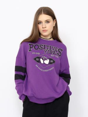 Джемпер для девушек с длинными рукавами оформлен в спортивном стиле. Свободный силуэт с заниженной линией плеча не сковывает движения. Нижние срезы переда и спинки оформлены притачным эластичным поясом. Рукава с эластичными манжетами по низу. Рукава и перед джемпера декорированы принтом "положительные эмоции".Дополнительно