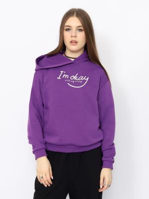 Толстовка для девушки с капюшоном и длинными рукавами из плотного трикотажа без начеса. Рукава с манжетами по низу. Притачной пояс и манжеты выполнены из полотна с эластаном. Перед толстовки декорирован принтом (я в порядке).Дополнительно