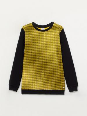 Джемпер слегка полуприлегающего силуэта, длиной до бедер. По низу джемпера притачной пояс. Рукав длинный из отделочного полотна на манжете. Круглая горловина обработана притачной обтачкой из кашкорсе с эластаном. По ростку проложен усилитель из экстрафорной ленты. С изнаночной стороны спинки выполнена печать-размерник. С левой стороны полочки по низу нашит металлический лэйбл со стразиком. Манжеты и пояс из кашкорсе с эластаном.Дополнительно