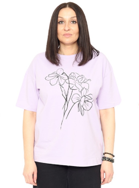 Футболка оверсайз длиной по линию бедер. Рукав до локтя. Круглая горловина обработана узкой притачной обтачкой из рибаны с эластаном. Полочка декорирована принтом.Дополнительно