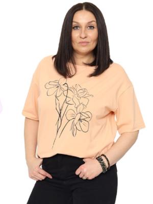 Футболка оверсайз длиной по линию бедер. Рукав до локтя. Круглая горловина обработана узкой притачной обтачкой из рибаны с эластаном. Полочка декорирована принтом.Дополнительно