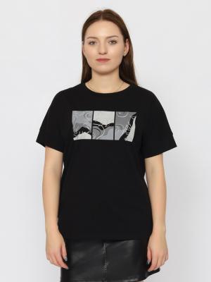 Футболка прямого силуэта удлиненная. Короткий цельнокройный рукав. Круглая горловина обработана узкой притачной обтачкой из рибаны с эластаном. Полочка декорирована принтом с использованием красок с блеском. Разрезы по бокам.Дополнительно