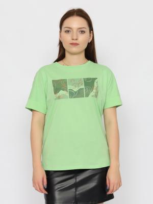 Футболка прямого силуэта удлиненная. Короткий цельнокройный рукав. Круглая горловина обработана узкой притачной обтачкой из рибаны с эластаном. Полочка декорирована принтом с использованием красок с блеском. Разрезы по бокам.Дополнительно