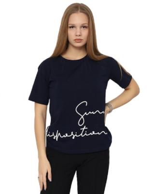 Футболка прямого силуэта длиной по линию бедер. Короткий рукав. Круглая горловина обработана узкой притачной обтачкой из рибаны с эластаном. Полочка декорирована принтом "Солнечный нрав".Дополнительно