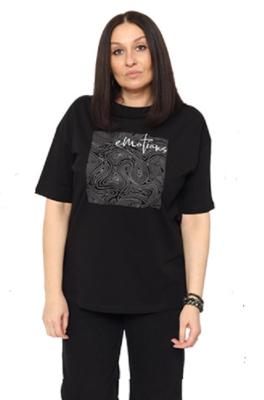 Футболка оверсайз длиной по линию бедер, с разрезами по бокам. Рукав до локтя. Круглая горловина обработана узкой притачной обтачкой из рибаны с эластаном. Полочка декорирована принтом. "эмоции".Дополнительно