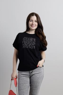 Футболка прямого силуэта длиной по линию бедер, цельнокроенный рукав. Круглая горловина обработана узкой притачной обтачкой из рибаны с эластаном. Полочка декорирована принтом "охладить".Дополнительно