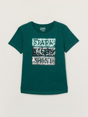 Футболка прямого силуэта длиной до бедер. Рукав короткий. Круглая горловина обработана узкой притачной обтачкой из рибаны с эластаном, отстрочка по шву притачивания. По ростку проложен усилитель из экстрафорной ленты. С изнаночной стороны спинки выполнена печать-размерник. На полочке выполнена вышивка пайетками. Низ футболки закругленный к боковым швам обработан на плоской.Дополнительно