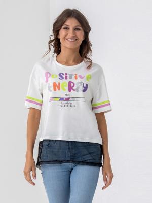 Футболка прямого свободного силуэта oversize, длиной чуть ниже бедер. Рукав на спущенном плече. Круглая горловина обработана притачной обтачкой из рибаны с эластаном. По ростку проложен усилитель из экстрафорной ленты. С изнаночной стороны спинки выполнена печать-размерник. На полочке выполнена шелкография в комбинированной технике с применением глиттера. По рукавам выполнена шелкография мягкими красками. Нижняя часть футболки из сетки. Спинка длиннее полочки.Дополнительно