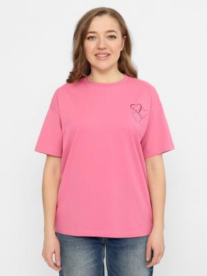 Футболка с короткими рукавами oversize, с удлинённой спинкой. Низ спинки оформлен дугообразно. Горловина круглая, обработана притачной бейкой из рибаны с эластаном. Перед футболки декорирован небольшим принтом.Дополнительно