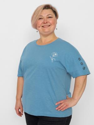 Футболка с короткими цельнокроенными рукавами. На рукавах - имитация шлицы с тремя декоративными пуговицами. Горловина круглая, обработана притачной бейкой из рибаны с эластаном. Перед футболки декорирован небольшим принтом.Дополнительно