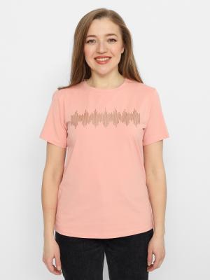 Футболка с короткими рукавами. Горловина круглая, обработана притачной бейкой из основного полотна. Перед футболки декорирован принтом с использованием блестящих красок, имитирующим пайетки.Дополнительно