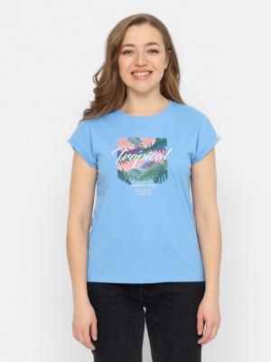 Футболка с короткими цельнокроенными рукавами с отворотами. Низ удлинённой спинки оформлен дугообразно. Горловина круглая, обработана притачной бейкой из рибаны с эластаном. Перед футболки декорирован принтом.Дополнительно