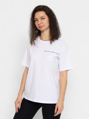 Футболка с небольшим текстовым принтом (надпись: Верь в свою силу) из натурального хлопка. Свободный крой oversize трендовый силуэт, круглый вырез горловины, короткие рукава со спущенной линией плеча. Футболка сочетается с классическими джинсами, спортивными брюками и шортами. Выбирайте футболки oversize для многослойных образов с рубашками, худи и свитшотами для летних образов.Дополнительно