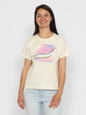Футболка женская оверсайз из кулирной глади. Воротник из эластичной рибаны. На полочке декоративный принт (расцветайте с изяществом, куда бы вас ни поместила жизнь), рельефные швы. Фигурный низ с удлиненной спинкой и боками.Дополнительно