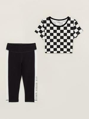 Футболка укороченная полуприлегающего силуэта длиной выше талии. Короткий рукав. Круглая горловина обработана узкой притачной обтачкой из отделочного полотна. По горловине отстрочка. По ростку проложен усилитель из основного полотна. С изнаночной стороны спинки выполнена печать-размерник. По низу рукава и футболки плоская. Бриджи облегающие, с отрезным поясом. Внутри пояса проложена эластичная тесьма. По боковым швам вставка контрастного цвета. По левой ножке ближе к низу выполнена шелкография в комбинированнной технике с транспалентом. Низ ножек на плоской.Дополнительно