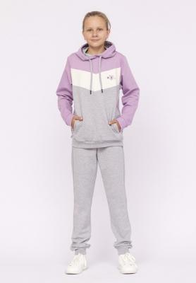 Толстовка с капюшоном. Капюшон на подкладе. В капюшоне обработана кулиска, кругловязаный шнур с пластиковыми наконечниками вставлен в петли. По ростку проложен усилитель из экстрафорной ленты. По низу рукава манжет. Манжеты и пояс выполнены из кашкорсе с эластаном. Пояс из двух частей, совпадающих по цвету с полочкой и спинкой. Полочка с фигурными подрезами, средняя часть из отделочного полотна, нижняя часть из полотна цвета брюк. На средней части небольшая шелкография, выполненная в комбинированной технике с применением блестящих красок. Брюки на манжете по ножкам. Отрезной пояс и манжеты выполнены из кашкорсе с эластаном. В поясе обработана кулиска, кругловязаный шнур с пластиковыми наконечниками вставлен в петли. Карманы наклонные, с отстрочкой по входу в карман.Дополнительно