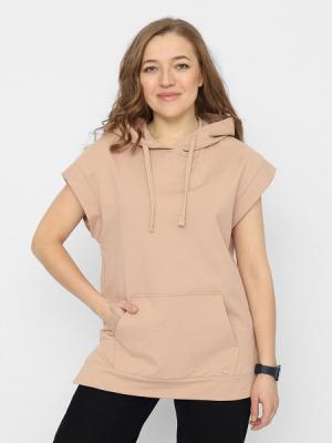 Жилет с капюшоном. По краю капюшона вставлен функциональный шнур. Плечо спущенное. Спинка удлинённая. В нижней части боковых швов обработаны разрезы. Проймы обработаны притачными планками, а низ спинки и переда - притачным поясом из основного полотна. Спереди - накладной карман "кенгуру". В левом нижнем углу кармана - декоративный металлический лейбл.Дополнительно