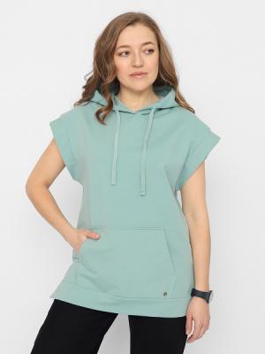 Жилет с капюшоном. По краю капюшона вставлен функциональный шнур. Плечо спущенное. Спинка удлинённая. В нижней части боковых швов обработаны разрезы. Проймы обработаны притачными планками, а низ спинки и переда - притачным поясом из основного полотна. Спереди - накладной карман "кенгуру". В левом нижнем углу кармана - декоративный металлический лейбл.Дополнительно