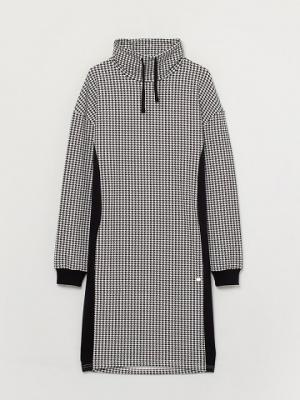 Платье полуприлегающего силуэта. Рукав длинный на манжете, манжета из кашкорсе с эластаном. Воротник мягкая высокая стойка с кулиской по краю воротника. В петли продет шнур с застроченными концами. На полочке вертикальные рельефы из проймы, смещенные к боковым швам. Отрезной бочок из отделочного полотна. В рельефах карманы. С левой стороны, ниже кармана, нашит металлический лэйбл со стразиком.Дополнительно
