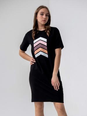 Платье прямого силуэта, чуть зауженное к низу, выше колена. Рукав короткий, на спущенном плече. Круглая горловина обработана притачной обтачкой из основного полотна. По ростку проложен усилитель из экстрафорной ленты. На полочке выполнена шелкография, в комбинированной технике с применением металлизированной краски.Дополнительно
