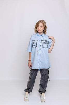 Удлиненная свободная модель с коротким рукавом. Классическая по фасону рубашка, с мультяшным граффическим принтом. Застежка на пуговицы, отложной воротник с застежкой под горло. Выполнена из плотной качественной ткани, которая проста в уходе, хорошо держит форму, идеальна для повседневной носки на каждый день.Дополнительно