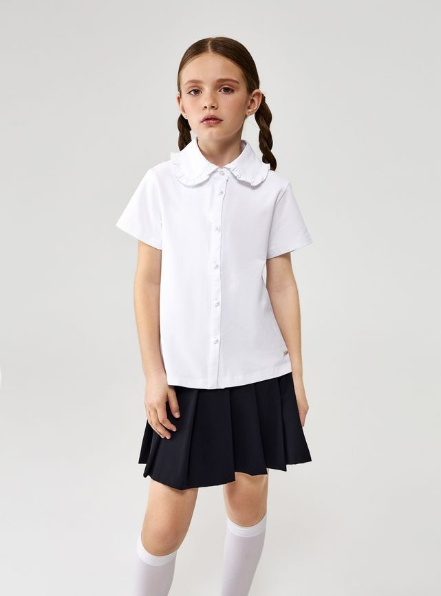 Школьная блузка с коротким рукавом для девочки - идеальный выбор для тёплых дней. Модель свободного силуэта обеспечивает комфортную посадку для разных типов фигуры. Застежка на пуговицы в виде жемчужинок придает модели нежный акцент. Несъёмный отложной воротник украшен по краю рюшью, что делает внешний вид изделия ещё более утончённым и подчёркивающим милую девичью натуру. Спереди по низу изделия расположена декоративная металлическая нашивка с названием бренда. Стилизуйте блузку в школьных образах с юбкой-плиссе (20240180069) и белыми гольфами, чтобы создать простой и модный аутфит. Также модель может стать частью школьной формы.Дополнительно