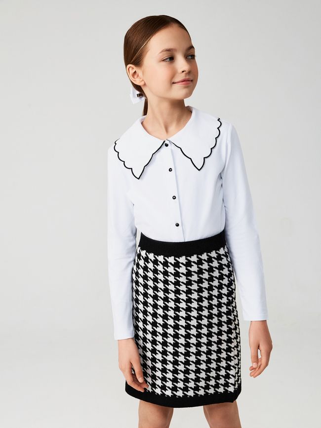 Школьная блузка с воротником для девочки выполнена из мягкого и приятного на ощупь трикотажа. Всесезонная модель с длинным рукавом без манжет подходит на прохладную погоду. Несъёмный отложной воротник с контрастной строчкой по краю - стильное дизайнерское решение, которое делает модель оригинальной. Волнообразный край воротника, подчёркнутый таким образом, придаёт изысканного шика. Застёжка на контрастные кнопки облегчает снятие и надевание, что особенно важно в дни секций и уроков физкультуры. Благодаря сдержанной отделке и базовому крою, блузка легко впишется в школьные образы с трикотажной юбкой (20240180091) и кардиганом или станет основой школьной формы.Дополнительно