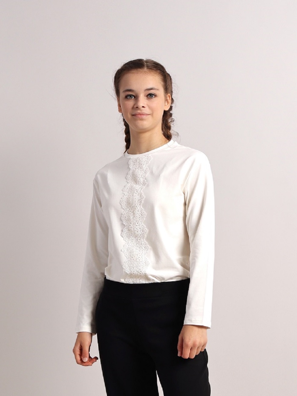 Джемпер свободного силуэта для девочки со спущенным плечом и длинными рукавами. Полочка декорированя кружевом. Воротник из основного полотна.Дополнительно
