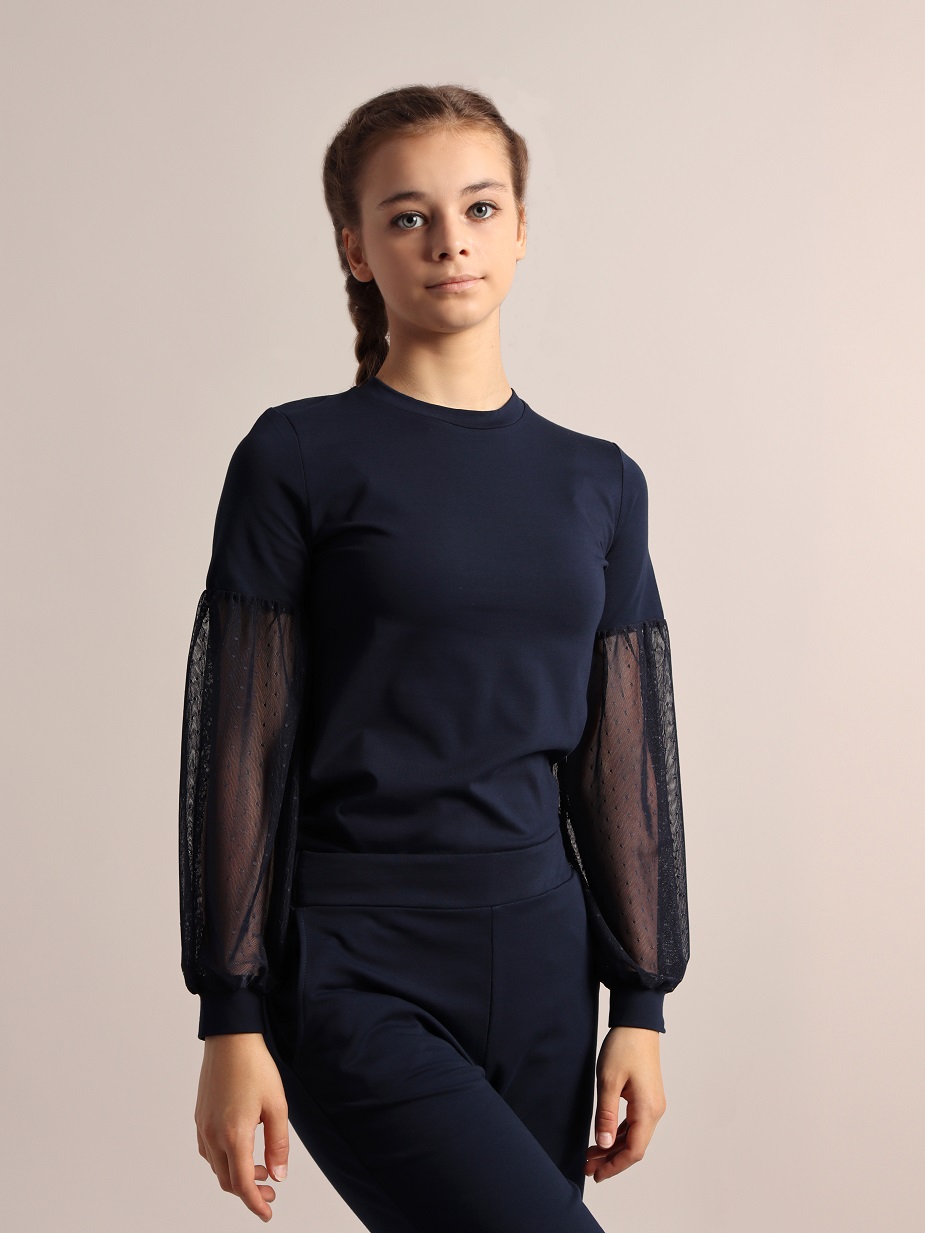 Джемпер для девочки с длинными втачными рукавами. Часть рукава выполнена из сетки с точками, снизу манжеты из основного полотна. Горловина круглая, обработана притачной бейкой из основного полотна.Дополнительно