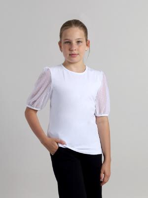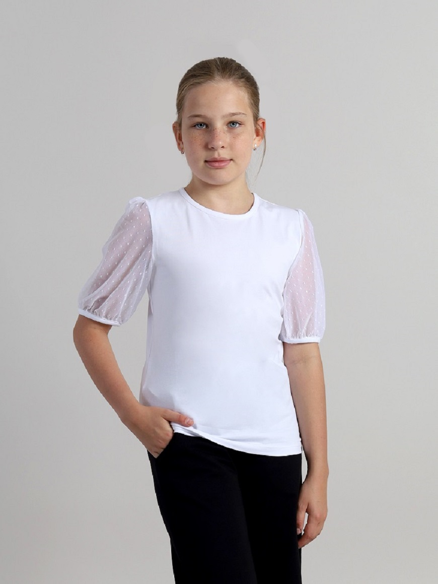 Блузка из трикотажного полотна для девочки. Спинка с вырезом-капелькой и застёжкой на пуговицу с петлей. Короткие рукава выполнены из мягкой сетки с точками.Дополнительно